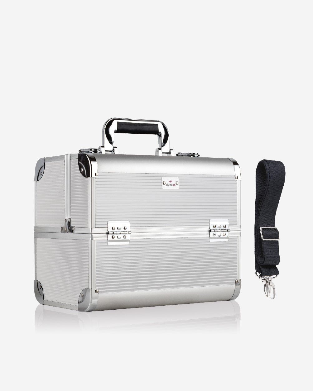 El maletín Divitech® fue fabricado con materiales resistentes y de excelente calidad, cuenta con 4 charolas desplegables, bordes de aluminio reforzado, asa de mano ergonómica, broche con cerradura y amplio interior, todas estas características lo convierten en una excelente opción para transportar sus artículos a cualquier lugar manteniéndolos en orden y seguros.